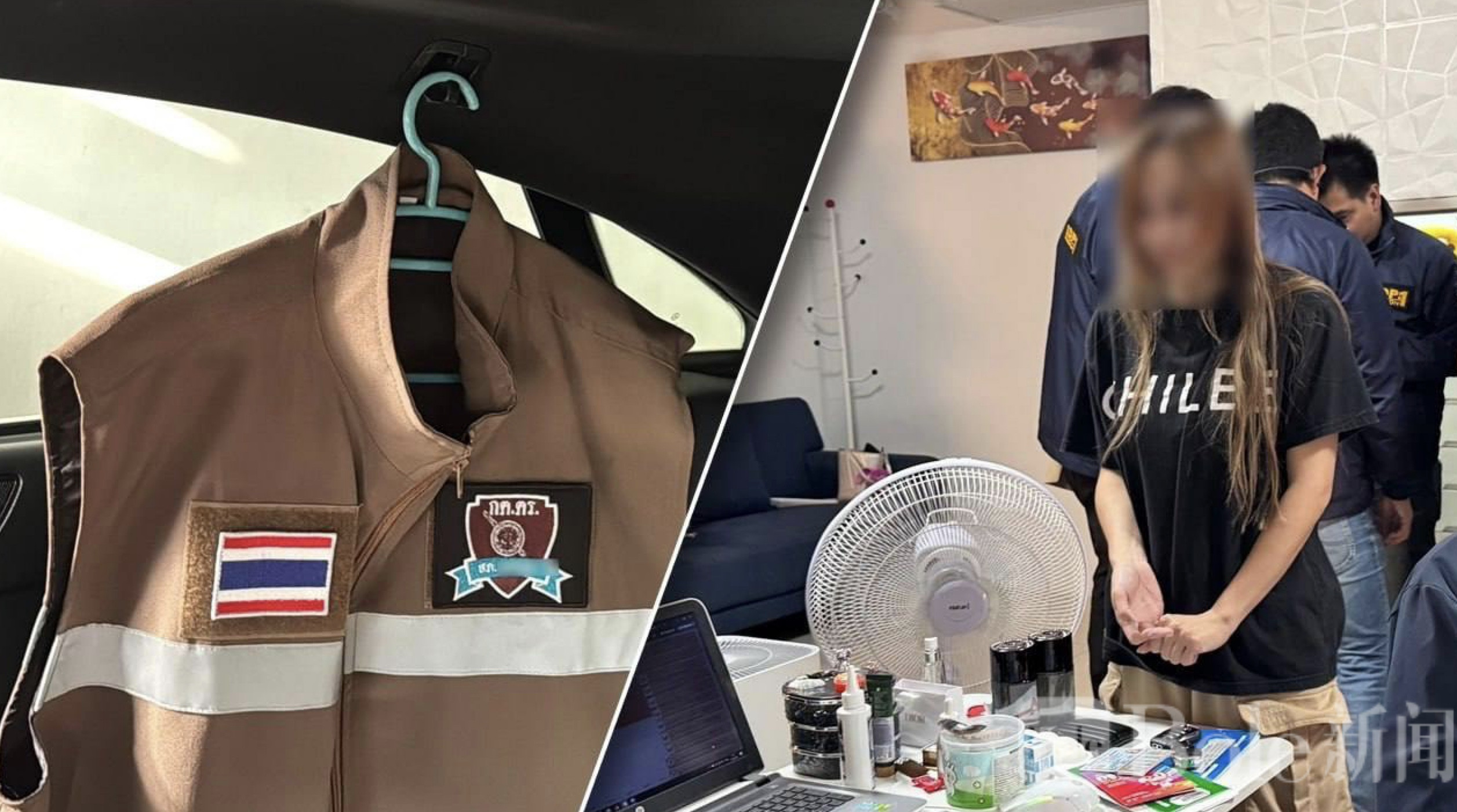 现场查获14部手机、3台电脑、19套银行账户资料、2辆涉案车辆及现金23.4万泰铢。令人关注的是,警方在一辆黑色奔驰车内发现一套疑似警察制服,来源及用途正在进一步调查。