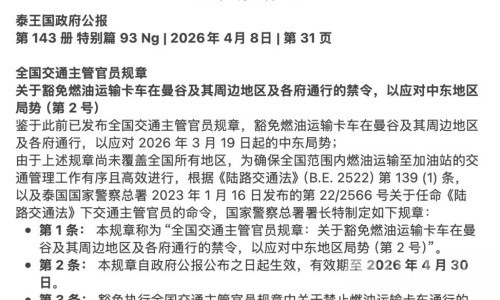 不过,官方同时表示,油罐车运输不受限制,可在全国范围内通行至4月30日,以保障燃油供应及民生需求稳定。