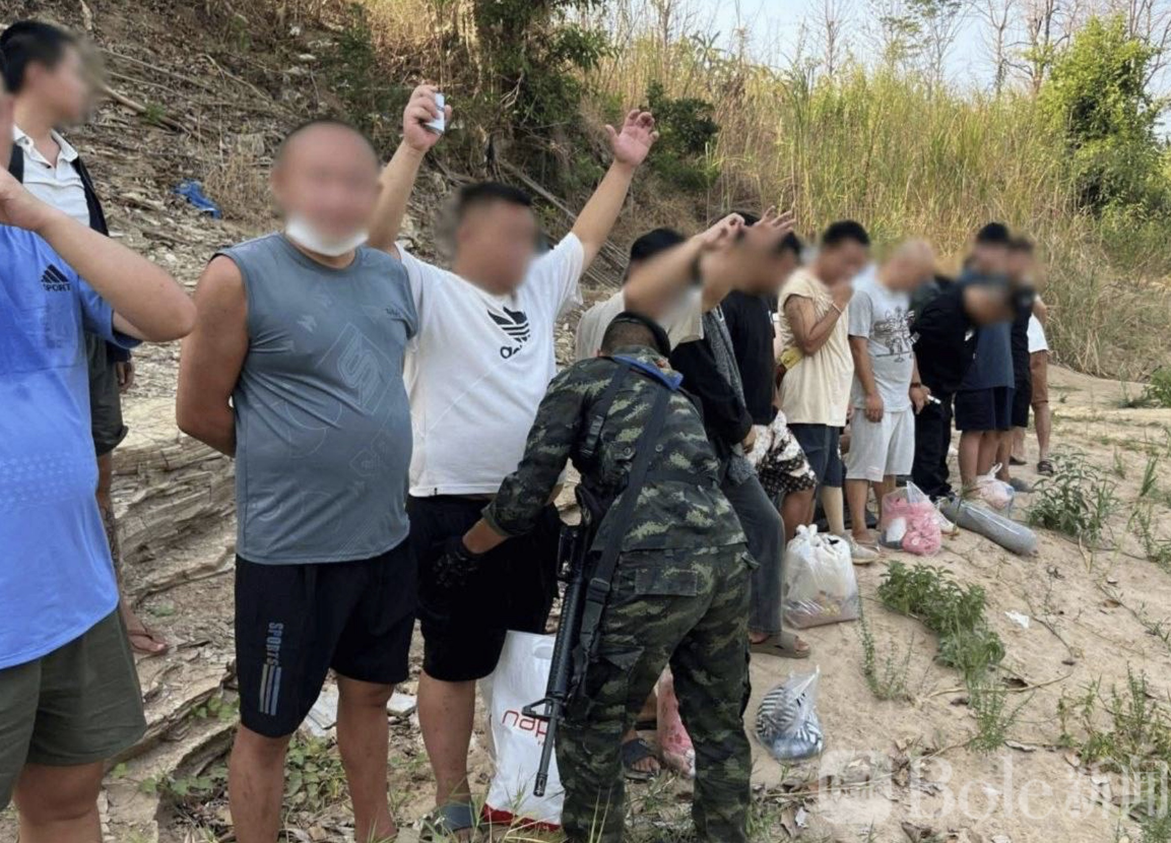 Bole新闻专讯:泰缅边境再现偷渡事件。4月11日上午,20名中国籍人员从缅甸克伦邦妙瓦底地区出发,试图越过边境进入泰国湄索,但在渡河后不久就被泰国军方巡逻部队当场拦截,整个行动几乎没有给他们留下太多逃离的空间。