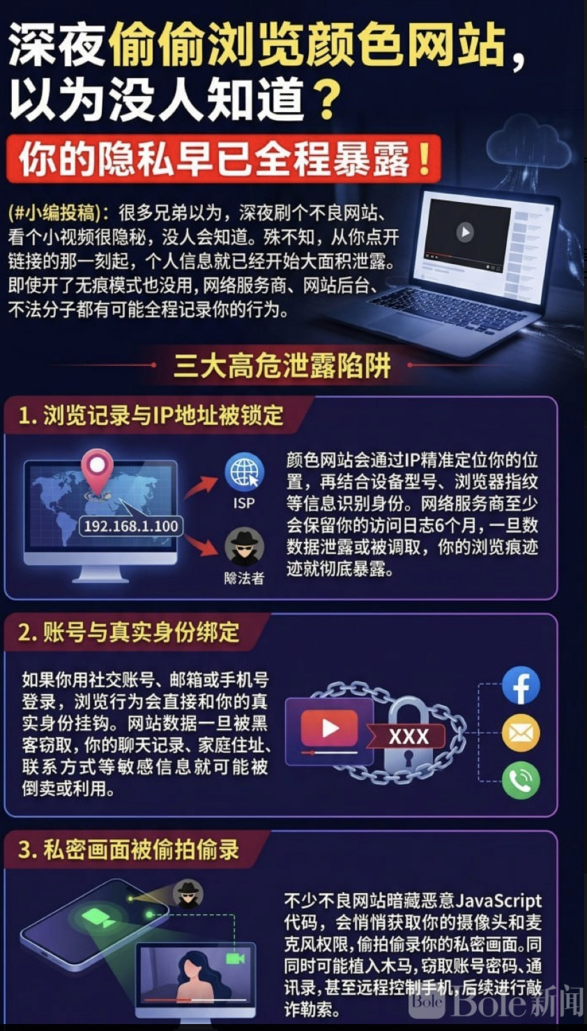 Bole新闻专讯:一些网络安全观察提醒称,部分用户在深夜浏览所谓“成人网站”时,往往误以为使用无痕模式或匿名工具就能完全隐藏痕迹,但实际上,从点击进入的那一刻起,相关访问行为就可能已经被多方记录与追踪,隐私安全存在一定风险。