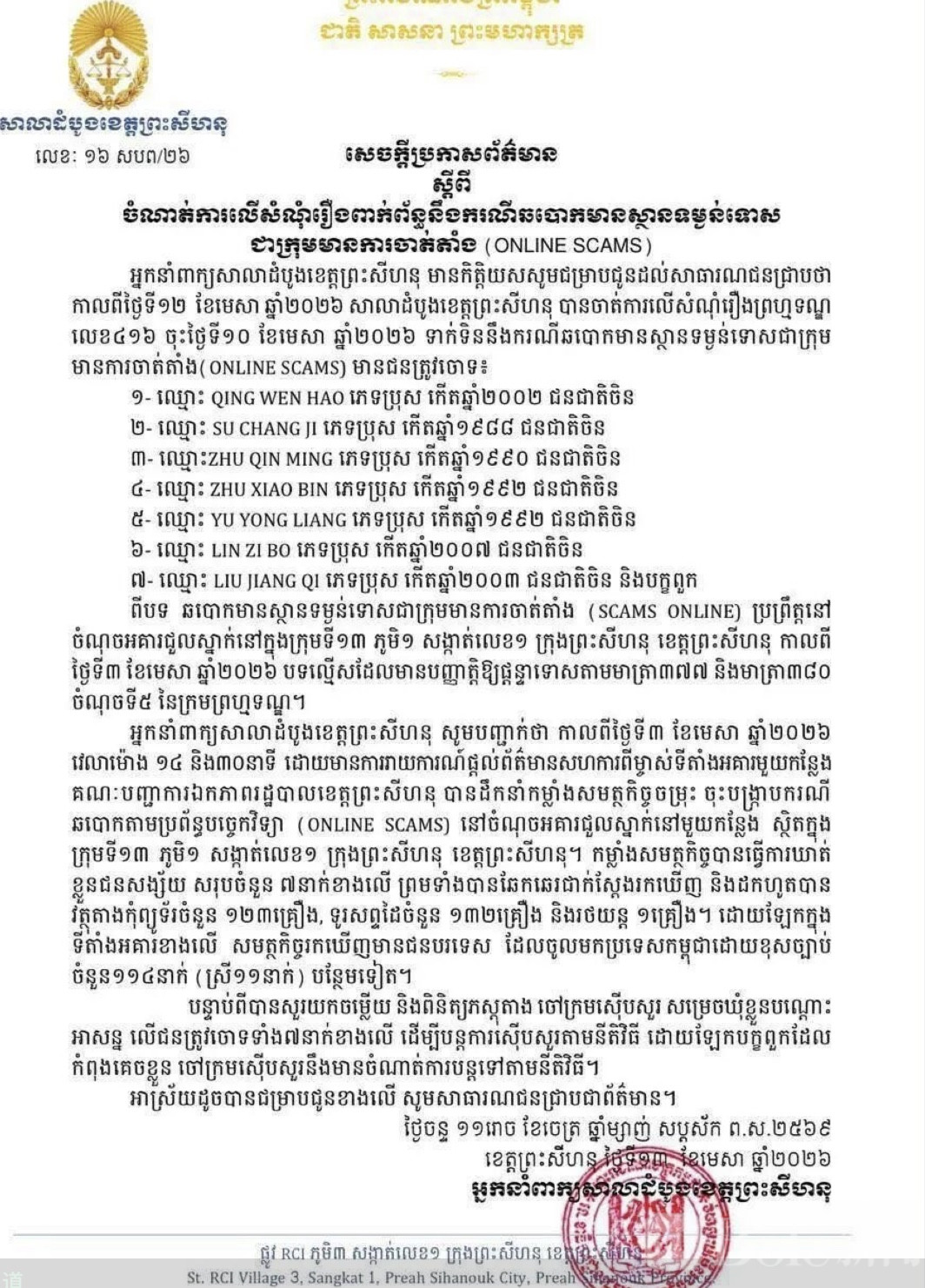 Bole新闻专讯:柬埔寨西哈努克港(西港)近日再度破获一起电信诈骗案件,7名中国籍男子被法院下令临时羁押。此次案件的关键线索,来自一名房东的主动举报,引发执法部门迅速行动。