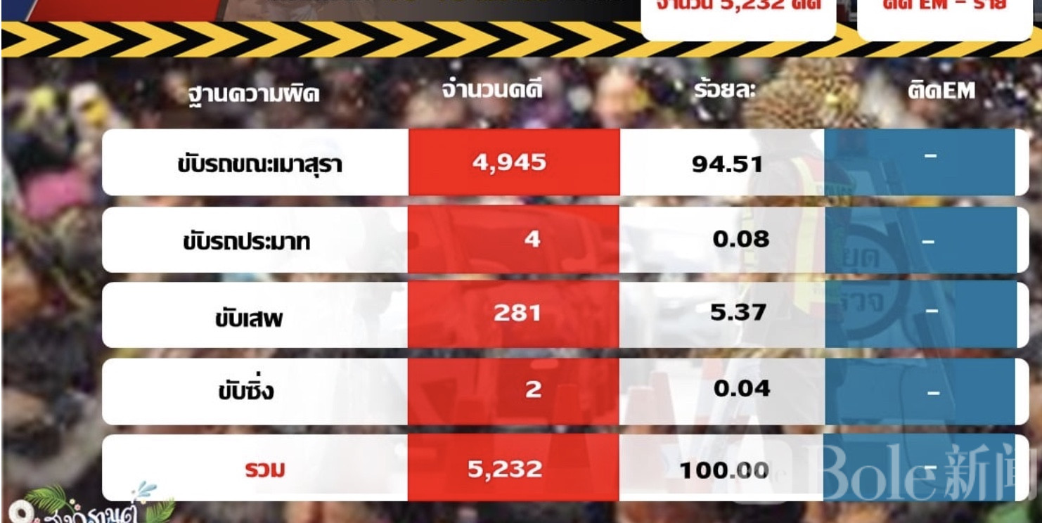 Bole新闻专讯:泰国在2026年泼水节期间加强道路安全执法,最新统计显示,4月10日至15日共6天内,全国“酒驾”相关案件累计达4,945起,其中清迈以680起居首,成为全国酒驾最高地区,引发社会对节日期间道路安全的高度关注。