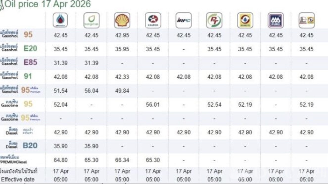 Bole新闻专讯:泰国能源政策与规划办公室(EPPO)公布2026年4月17日最新燃油零售价格,涉及PTT、Bangchak、PT、Shell及Caltex等五大主要加油站品牌,部分汽油价格出现调整,而柴油价格整体维持稳定。