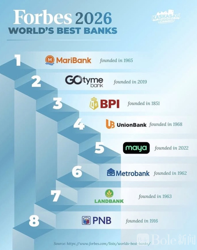 Bole新闻专讯:在最新公布的全球银行评选中,菲律宾银行业的格局似乎正在悄悄发生变化。根据《福布斯》发布的2026年全球最佳银行榜单,菲律宾共有8家银行成功上榜,其中,一家数字银行意外冲到第一名的位置,多少让不少业内人士感到惊讶。