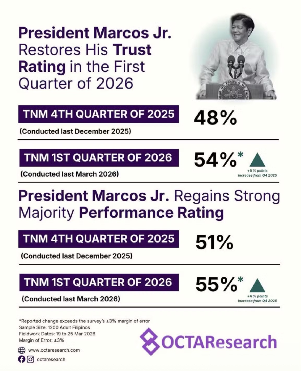 Bole新闻专讯:菲律宾政坛最新民调结果新鲜出炉,总统小费迪南德・马科斯在 2026 年第一季度的信任度与业绩评分均实现温和回升,成功摆脱去年第四季度的低谷;与之形成鲜明对比的是,副总统莎拉・杜特尔特的业绩评分则出现小幅下滑,呈现出 “一升一降” 的微妙格局,这一结果来自菲律宾民调机构 OCTA Research 的 “人民之声”(Tugon ng Masa)调查,于 4 月 20 日周一正式对外公布。