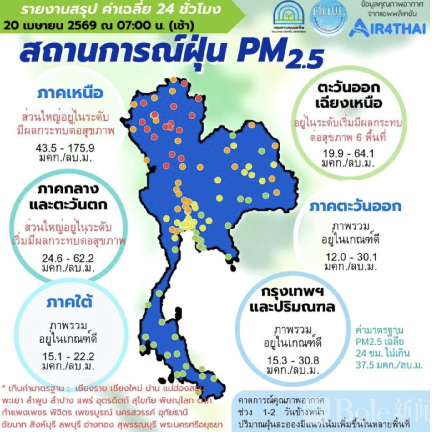 Bole新闻专讯:泰国空气污染问题持续加剧,北部地区PM2.5浓度依然处于危急水平,全国多达31个府空气质量超出安全标准,对民众健康造成明显影响。