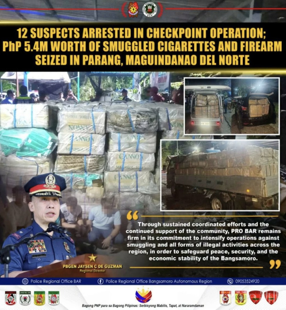 Bole新闻专讯:菲律宾警方近日在马京达瑙北部一处检查站截获一起香烟走私案件,查获价值约540万比索的走私香烟,并当场控制12名嫌疑人,其中包括一名未成年人,案件目前仍在进一步调查中。