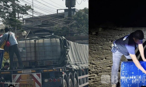 据报道,泰国第35边防巡逻队第3506连联合达府湄索县警方及行政部门,在边境巡逻期间,于达府湄颂县班玛斯里鲁昂村2组货运码头附近发现一辆可疑车辆正在搬运物品。司机发现执法人员后立即弃下油桶驾车逃逸。现场查获3个200升汽油桶,共计600升燃油。