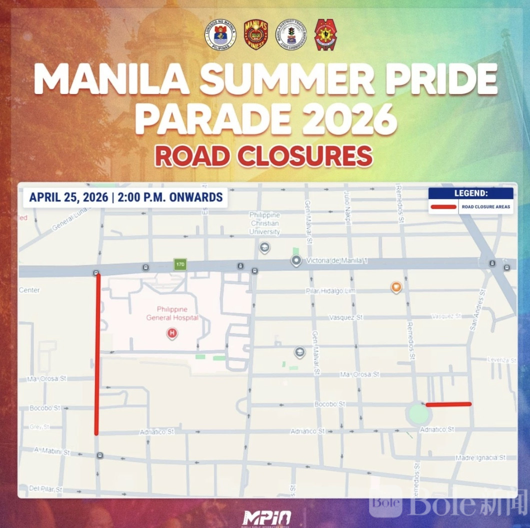 Bole新闻专讯:马尼拉市政府提醒市民,4月25日举行“马尼拉夏日骄傲游行2026”期间,市区多条道路将实施临时封闭与改道措施,部分路段还将采取间歇性交通管制,预计当天交通会出现一定程度拥堵,建议民众提前规划路线,尽量绕行。