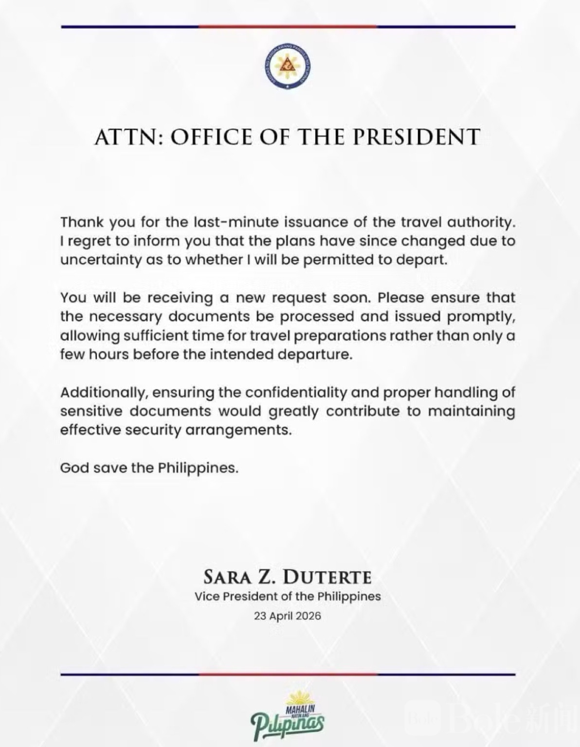 Bole新闻专讯:菲律宾副总统莎拉·杜特尔特表示,将重新提交出境旅行申请,并希望相关部门尽快处理审批流程。她同时提到,由于目前是否获准出境存在不确定性,原定海外行程已发生调整。