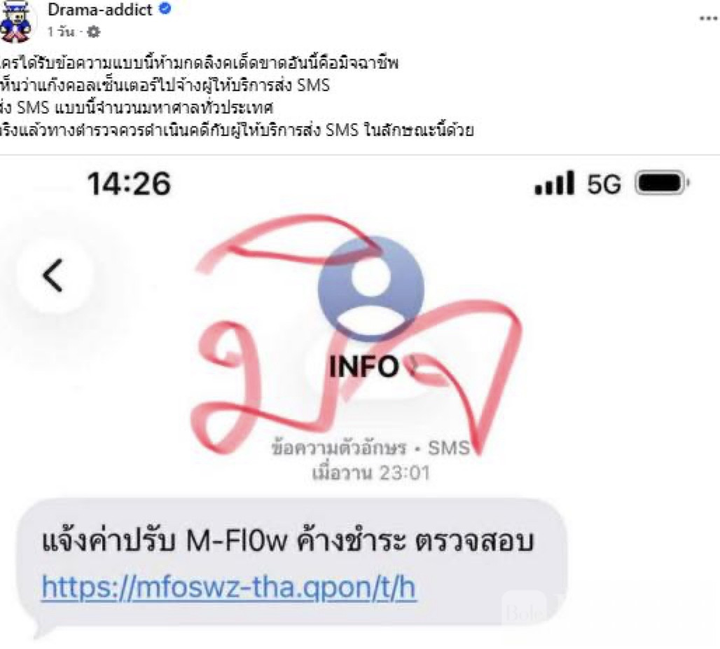 Bole新闻专讯:近期一种新型短信诈骗在泰国持续蔓延,不法分子冒充“高速收费欠款通知”,向大量民众群发信息,诱导点击链接实施诈骗,已有不少人险些中招。