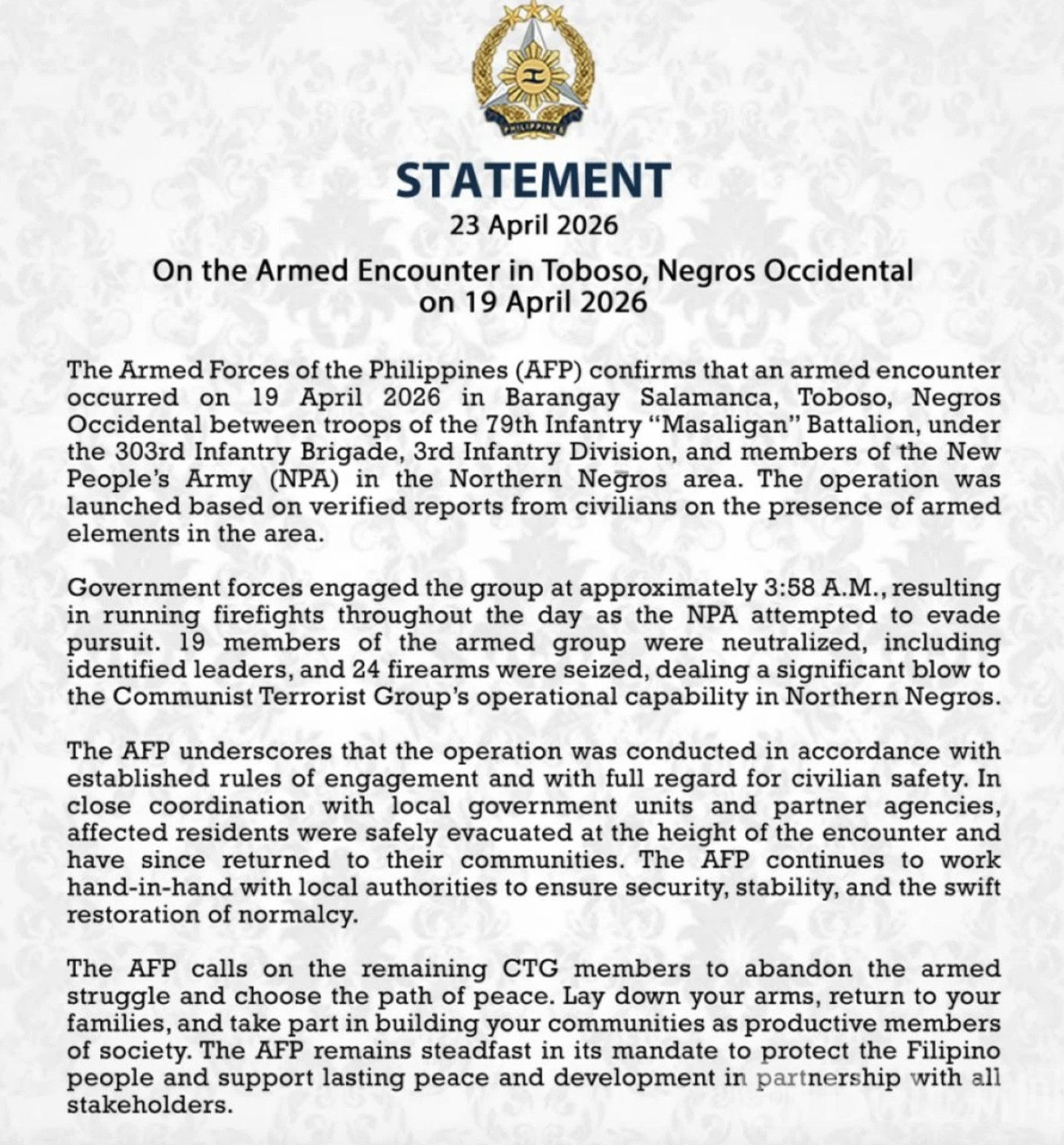 就在悲剧发生之后不久,当地执法部门乘势展开清剿抓捕行动。4 月 22 日当天,内格罗斯岛地区警方在塔里赛市马塔班村开展专项抓捕行动,针对一名通缉人员展开围捕,一举抓获 5 名相关武装人员。