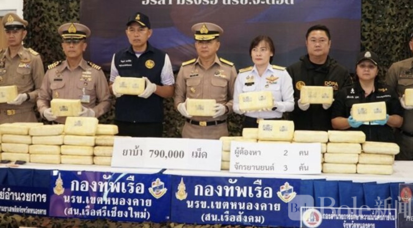 Bole新闻专讯:泰国廊开府一带近日再度查获大宗跨境毒品案件。当地水上安全部队联合多方执法力量展开联合行动,在一处橡胶园内成功截获约七十九万粒冰毒,并当场拘捕两名涉嫌运输毒品的男子,案件总价值估计超过三千九百万泰铢,折合约数亿元级别,引发外界关注。
