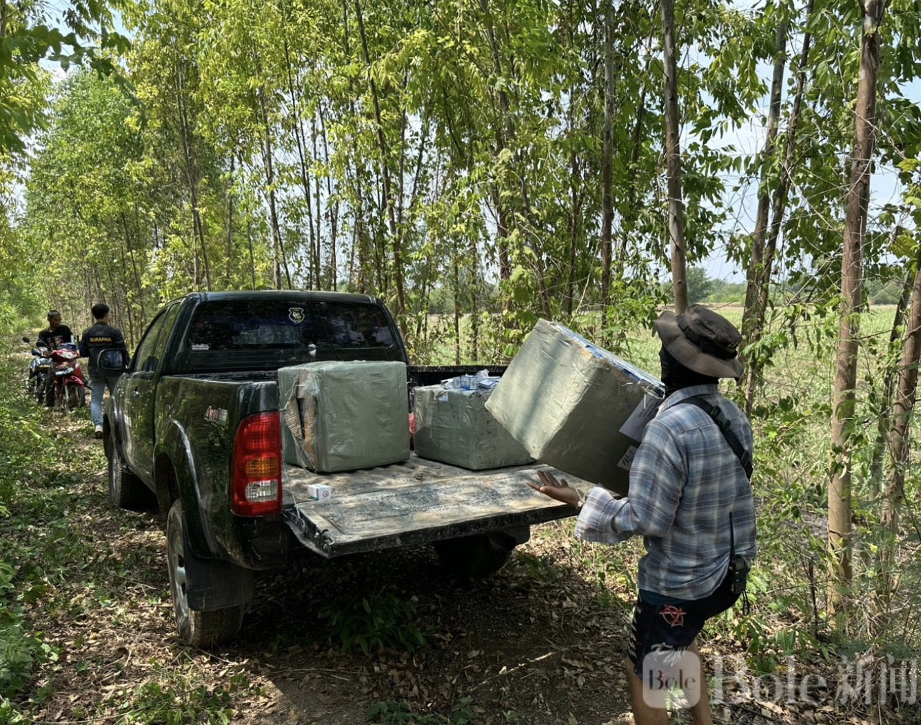 现场执法人员随即展开追捕,但两名嫌疑人利用地形优势跳入边境水道,最终成功逃入柬埔寨方向。执法人员随后对遗留物品进行检查。