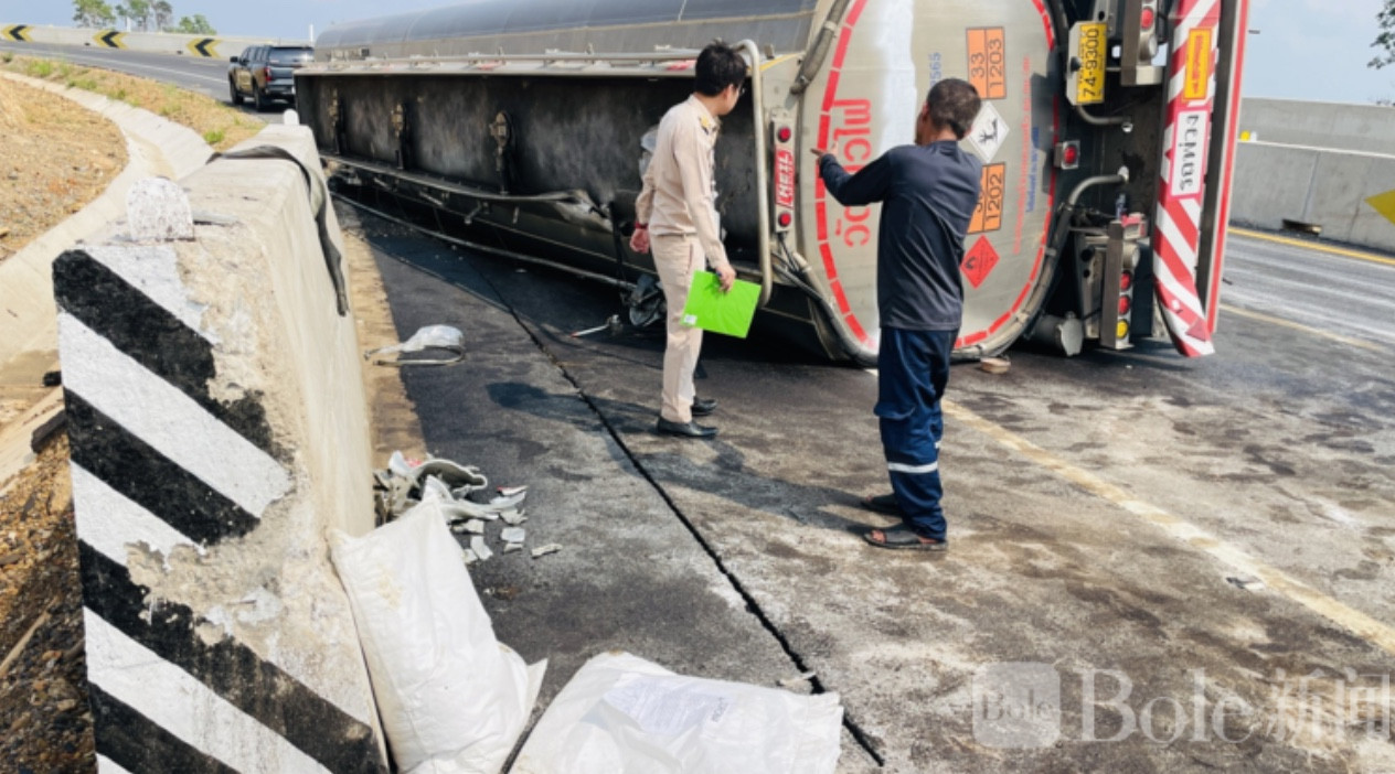 Bole新闻专讯:泰国楠府通昌县27日发生一起油罐车侧翻事故,一辆载有约4万升燃油的半挂油罐车在弯道路段失控翻覆,约5000升燃油泄漏并流到路面,一度引发紧张气氛。所幸当地多部门迅速赶到现场处置,目前情况已经基本稳定,道路交通也恢复正常。