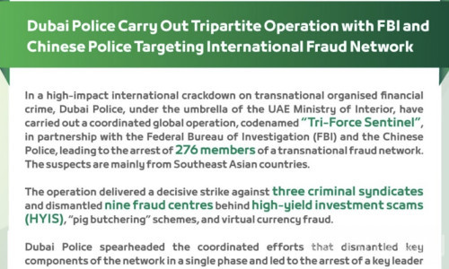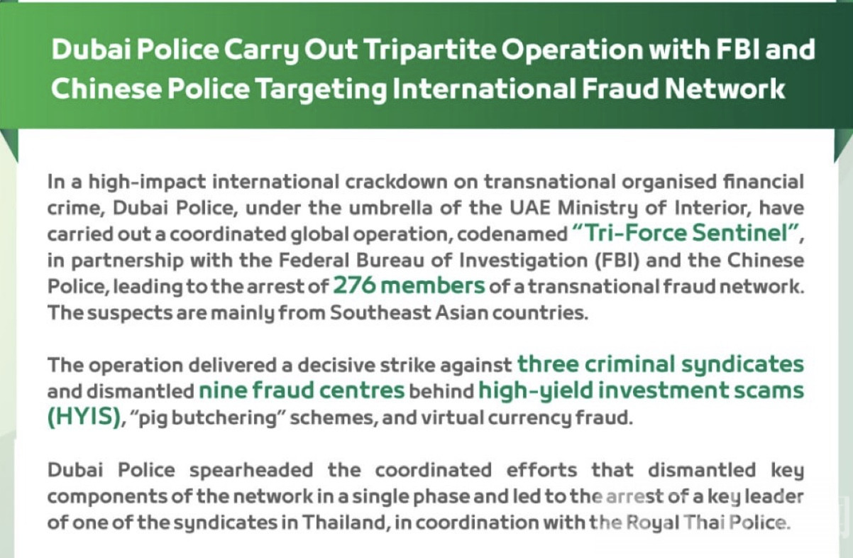Bole新闻专讯:迪拜警方近日宣布,在美国联邦调查局与中国警方协同配合下,成功展开代号“Tri-Force Sentinel”的联合执法行动,一举打掉一个跨国金融诈骗网络,行动规模与协同程度引发国际关注。