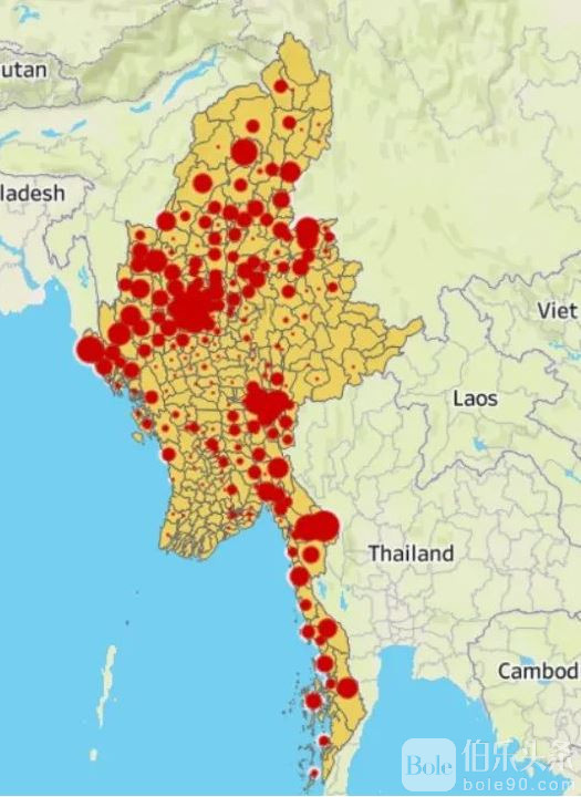 BNI的统计数据还显示,自2021年2月1日至2024年8月6日,缅甸共爆发了4,982场战争。在缅甸共330个镇区中,冲突已蔓延至222个,覆盖了缅甸67%的土地。
