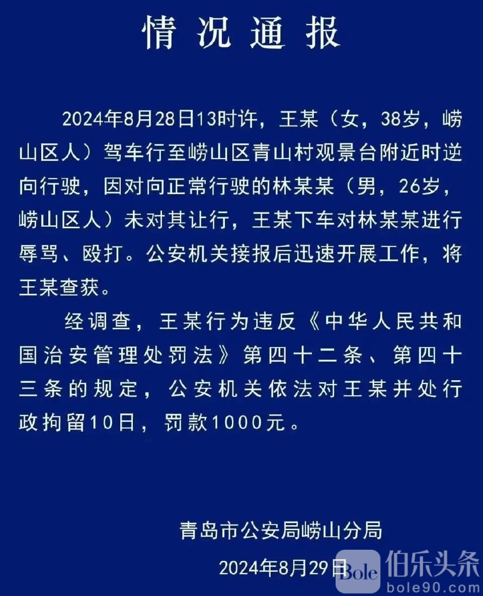 起因是8月28日下午1时许,王某(女,38岁,崂山区人)驾车行至崂山区青山村观景台附近时,突然逆向行驶插队。因为在插队的过程中,对向正常行驶的车辆(车主林某,26岁,崂山区人)没有对其避让,所以王某下车,对林某不仅进行了言语上的侮辱,还动手扇了他十多个耳光。
