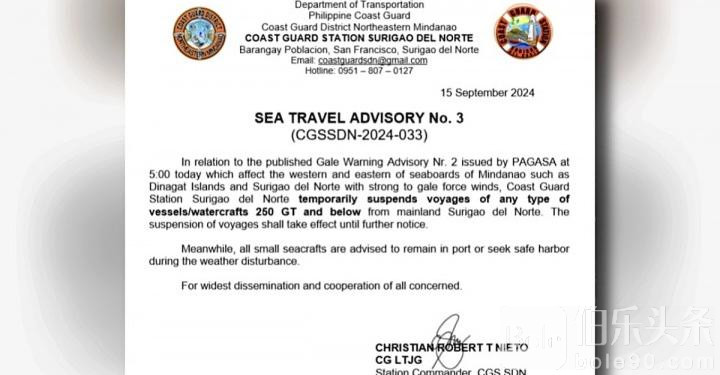 伯乐头条专讯:菲律宾海岸警卫队周日暂停了海上航行,原因是西南季风带来的强风影响了北苏里高、南苏里高和迪纳加特岛的大部分地区。