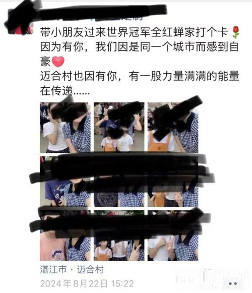 当全红婵从迈合村的商务车上下来的时候,游客就开始激动起来,欢呼的、拍照的、直播的,一个比一个热闹。