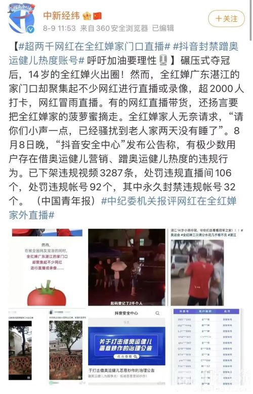 后来,因为来全红婵家蹭流量的网红太多,这件事还上了热搜,一百多个账号被封禁。