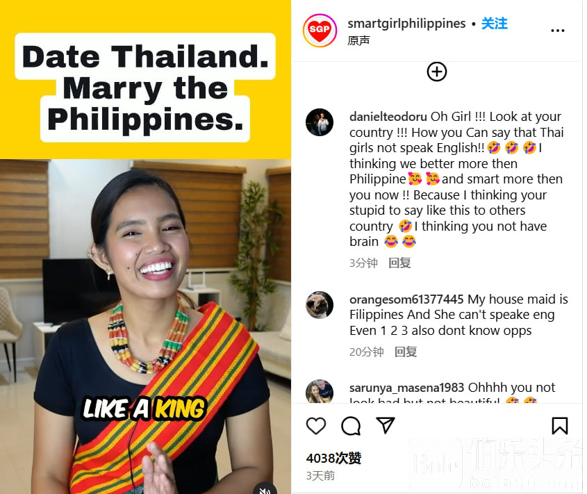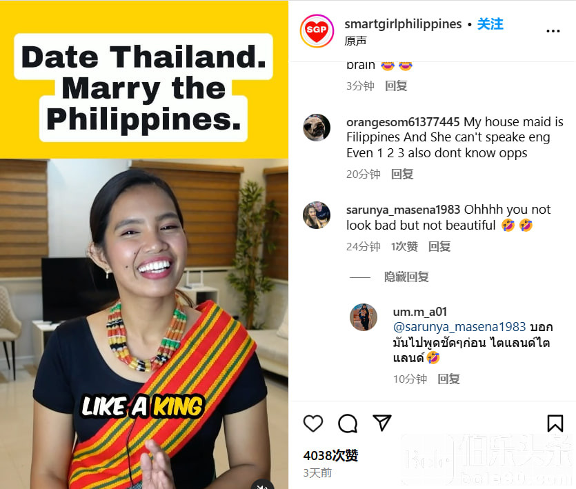 伯乐头条专讯:一觉醒来,一名菲律宾女网红发现,自己已经身处社交媒体风暴中心,因为她发布的一段视频被广泛传播,激怒了泰国网民。这位网名为smart girl philippines的女网红在社交媒体上,瞬间引发了巨大争议,她对泰国女性进行了猛烈的抨击,称她们“随便”且“贪财”。