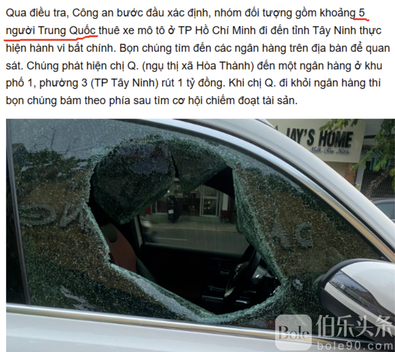 拿到Q.女士给的钱后,Y.女士把钱放进车里,然后开车前往和城市社的一家餐馆用餐。Y.女士下车后,团伙中的一名男子迅速靠近Y.女士的车,打破车窗偷走钱,然后一伙人朝着隆安省逃去。
