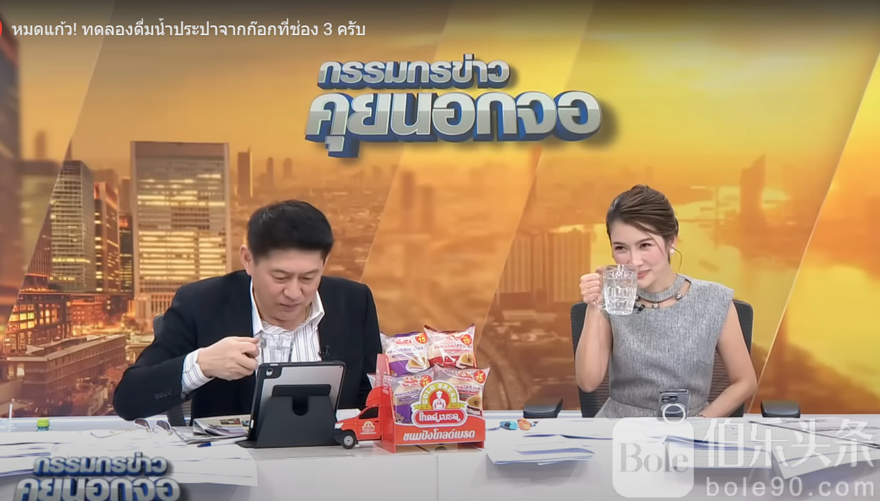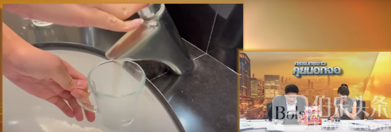 伯乐头条专讯:11月22日晚间时分,索拉育和他的搭档主持人 Bright Phichayatan,在节目中直接饮用了一杯从水龙头接下的自来水,希望增强民众对泰国政府供水系统等各方面基础设施建设的信心。而众所周知的是,泰国自来水水质是非常差的。