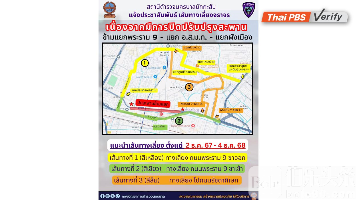 伯乐头条专讯:曼谷Makkasan Metropolitan警察局近日通过其Facebook页面发布了交通调整公告,提醒市民避开拉玛九路口天桥、MCOT路口和Phang Mueang路口等主要交通路段。