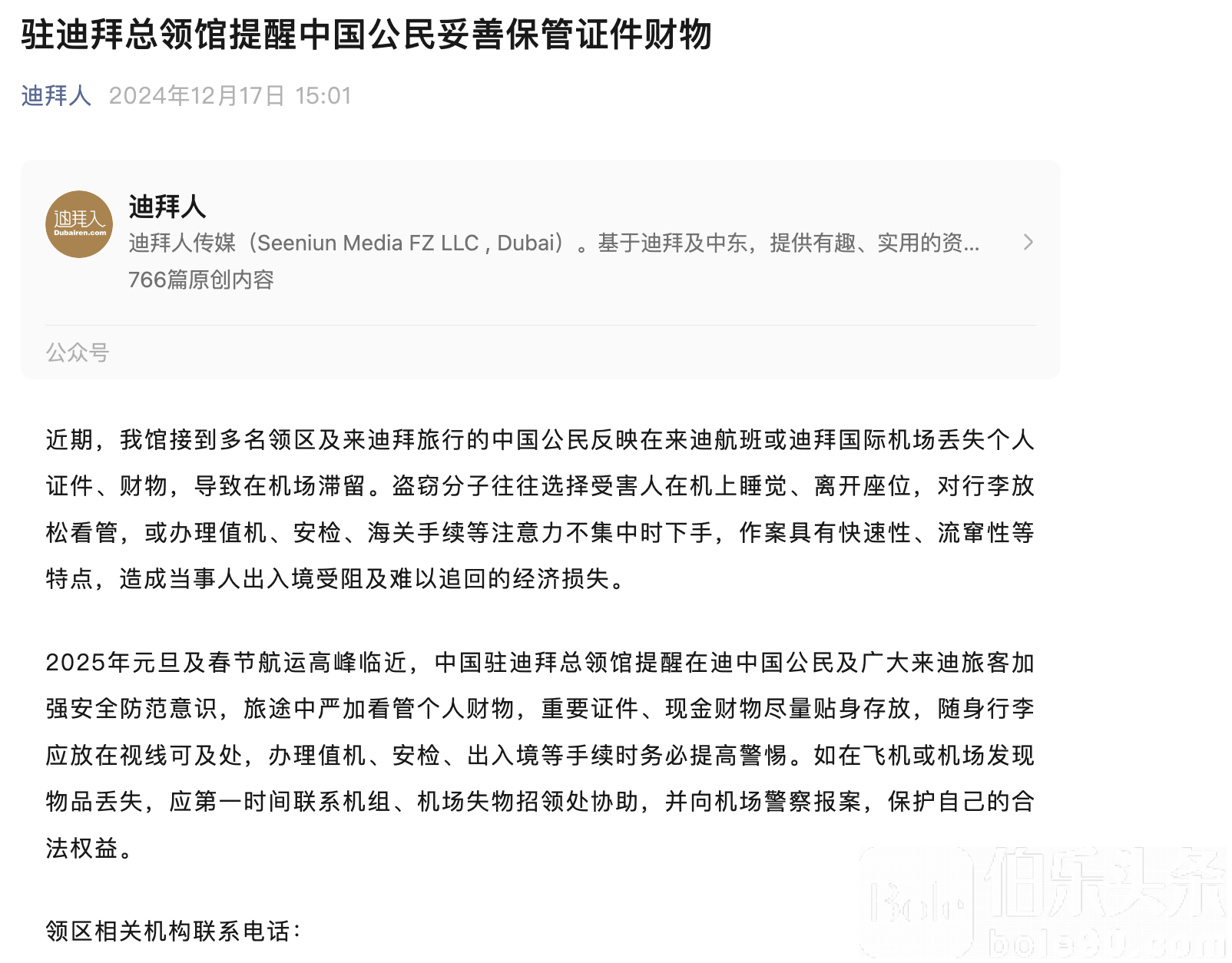 2025年元旦及春节航运高峰临近,中国驻迪拜总领馆提醒在迪中国公民及广大来迪旅客加强安全防范意识,旅途中严加看管个人财物,重要证件、现金财物尽量贴身存放,随身行李应放在视线可及处,办理值机、安检、出入境等手续时务必提高警惕。如在飞机或机场发现物品丢失,应第一时间联系机组、机场失物招领处协助,并向机场警察报案,保护自己的合法权益。