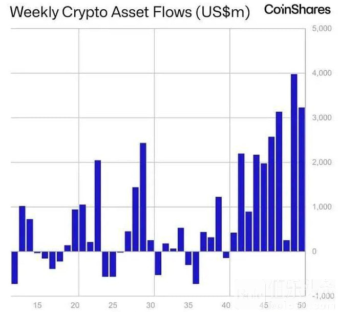 综上所述,比特币再创新高,以太坊紧随其后,全球加密基金的巨额流入与政策利好为市场提供了坚实的支撑。伴随“圣诞行情”提前启动,加密货币市场有望迎来更广泛的牛市反弹。