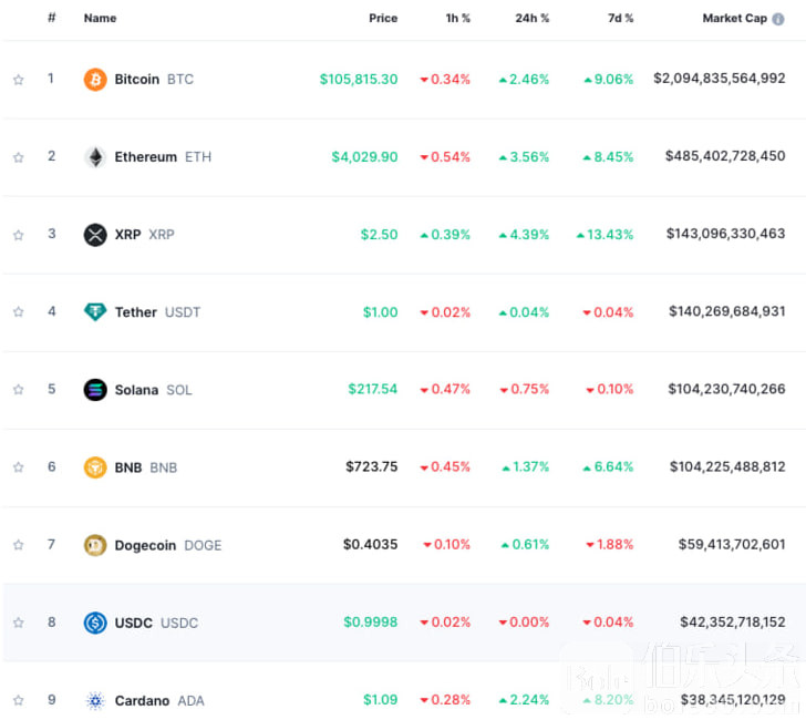 伯乐头条专讯:美国东部时间周一13:30左右,比特币价格再度突破历史新高,达到107,822美元,较上周五尾盘上涨约5.5%。虽然随后涨势略有回落,截至发稿时,比特币价格报105,815美元,当日上涨近3%,周涨幅达到9%。与此同时,以太坊也紧随其后,一度触及4,081美元,创下自2021年12月以来的最高水平。当前以太坊价格稳定在4,029美元,尽管距离2021年11月创下的4,878美元的历史高点仍有16%的差距,但市场情绪依然乐观。