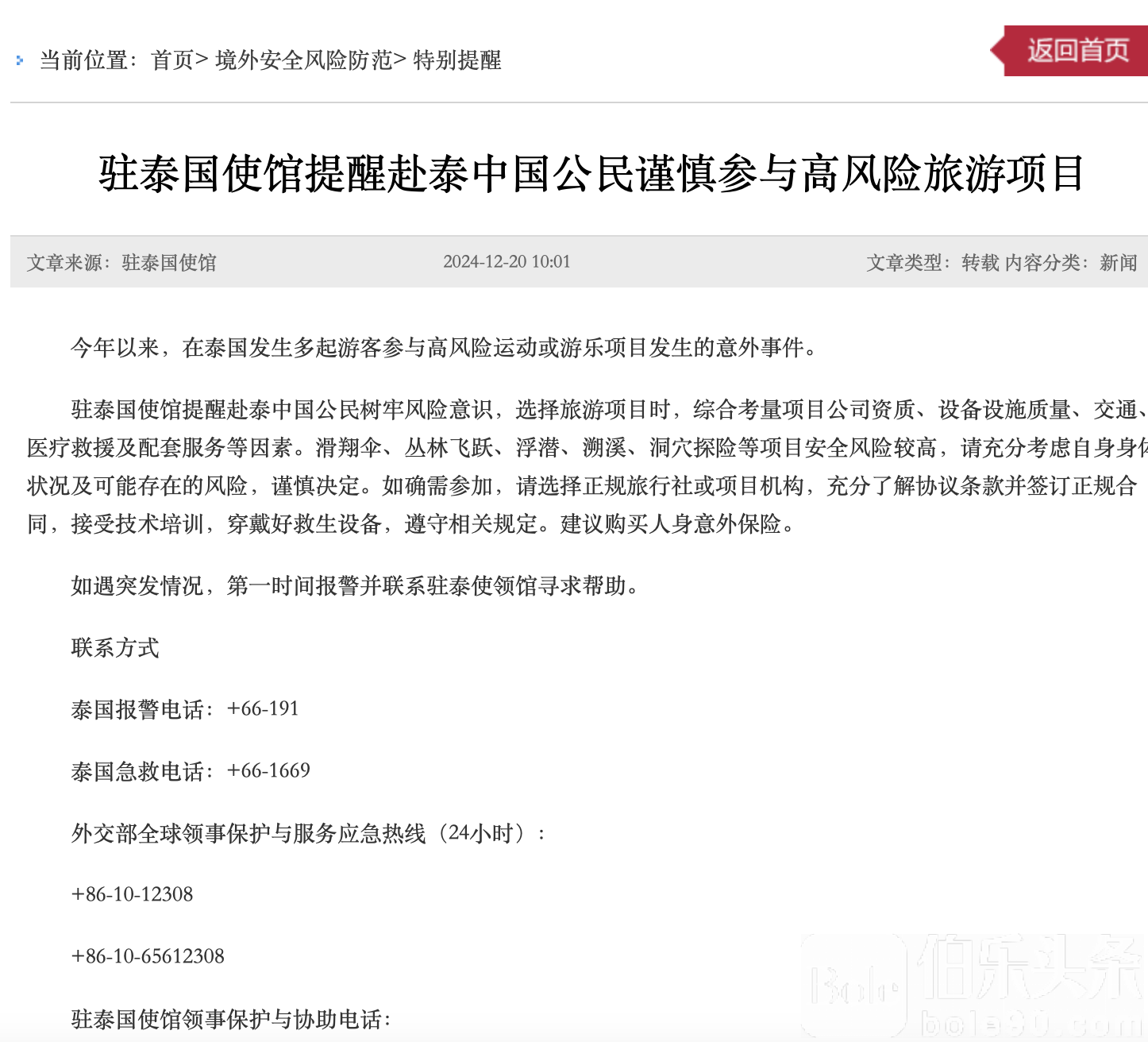 驻泰国使馆提醒赴泰中国公民树牢风险意识,选择旅游项目时,综合考量项目公司资质、设备设施质量、交通、医疗救援及配套服务等因素。滑翔伞、丛林飞跃、浮潜、溯溪、洞穴探险等项目安全风险较高,请充分考虑自身身体状况及可能存在的风险,谨慎决定。如确需参加,请选择正规旅行社或项目机构,充分了解协议条款并签订正规合同,接受技术培训,穿戴好救生设备,遵守相关规定。建议购买人身意外保险。