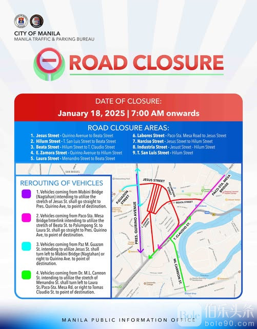 马尼拉公共信息办公室(MPIO)周六宣布,从周六上午 7 点开始关闭道路。 受影响的街道包括:耶稣街-Palumpong 街(Quirino 大道至 Beata 街);Hilum 街(Teodoro San Luis 街至 Beata 街);Beata 街(Hilum 街至 T. Claudio 街);E. Zamora 街(Quirino 大道至 Hilum 街);Laura 街(Menandro 街至 Beata 街);Labores 街(Paco-Sta Mesa 路至耶稣街);Laura 街(Menandro 街至 Beata 街);Labores 街(Paco-Sta Mesa 路至耶稣街)。 Zamora St. (Quirino Ave. to Hilum St.);Laura St. (Menandro to Beata St.);Labores St. (Paco-Sta. Mesa Rd. to Jesus St.);Narciso St. (Jesus St. to Hilum St.);Industria St. (Jesus St. to Hilum St.);Teodoro San Luis St. (Jesus St. to Hilum St.)。