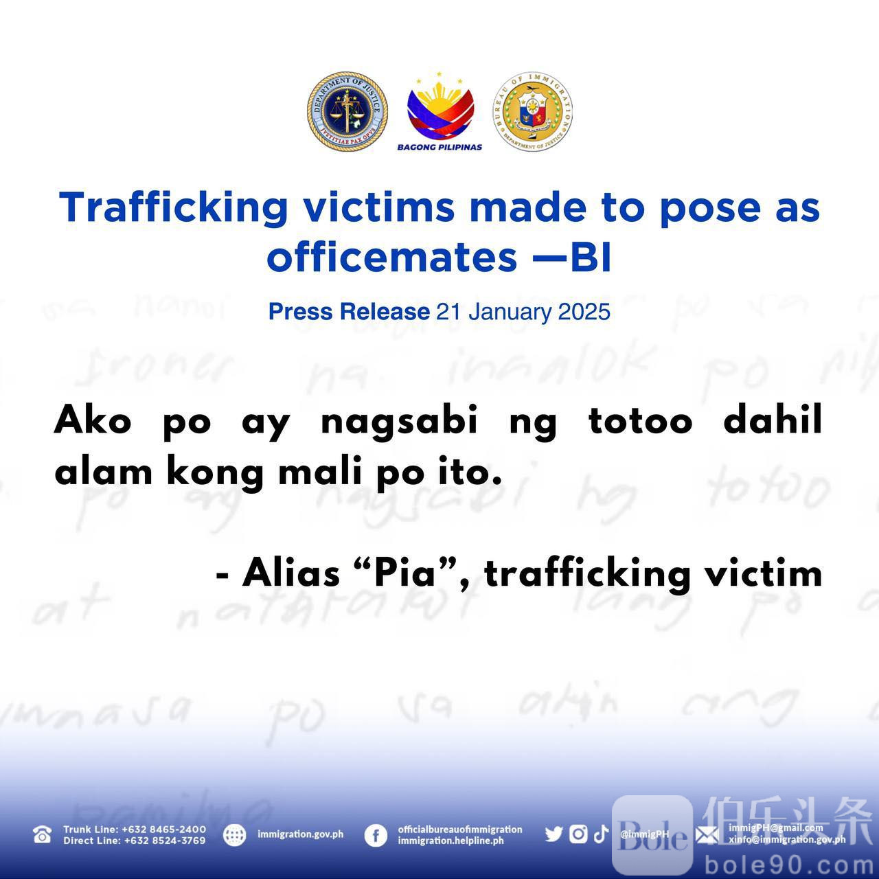 伯乐头条专讯:菲律宾移民局 (BI) 局长 Joel Anthony Viado 警告公众,人贩子正采用冒充同事的新策略,企图非法将人口运往国外。