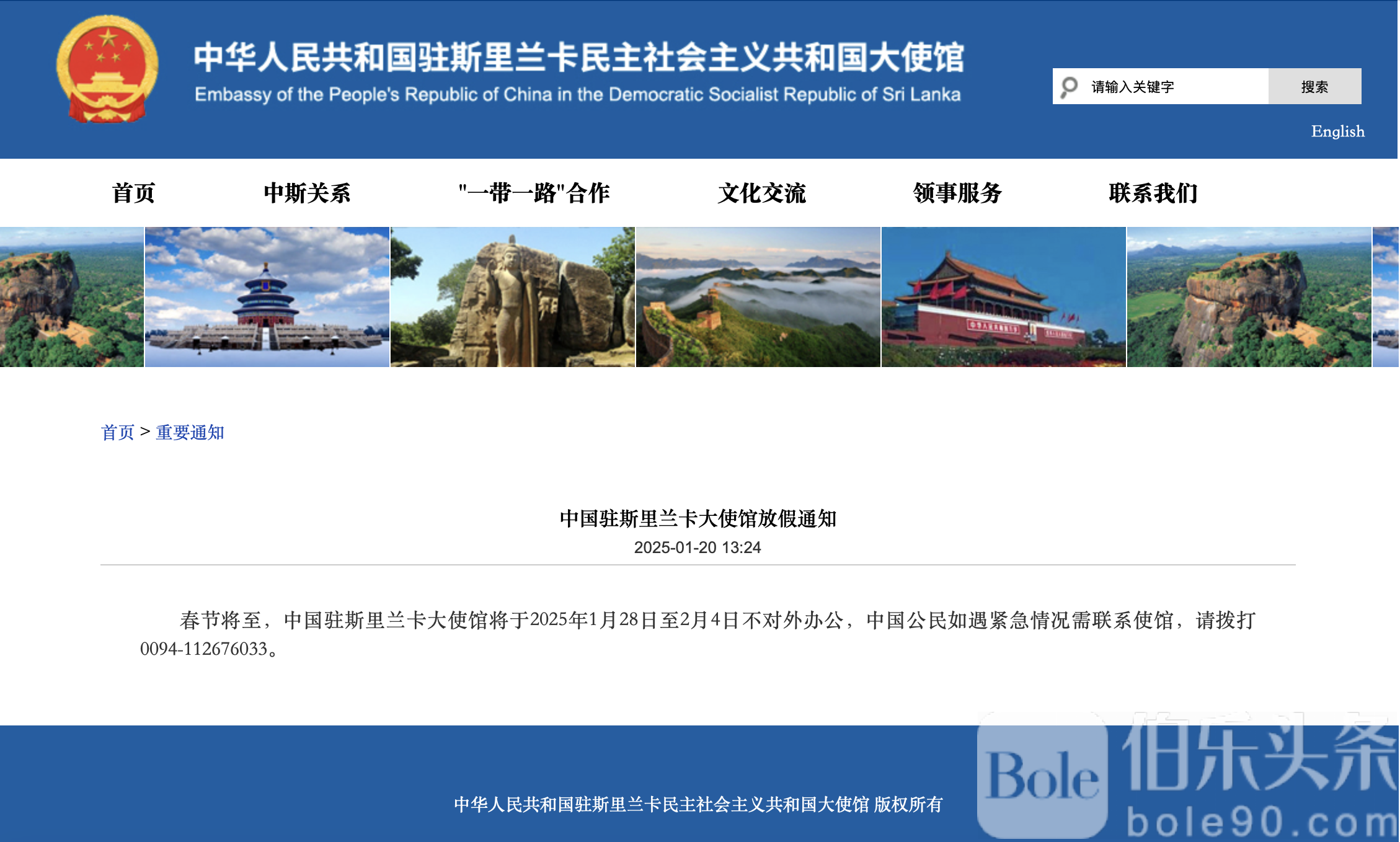 Kindly reminded that from 28 January 2025 to 4 February 2025, the Chinese Embassy in Sri Lanka will be closed for the Spring Festival. Thank you for your understanding and cooperation.