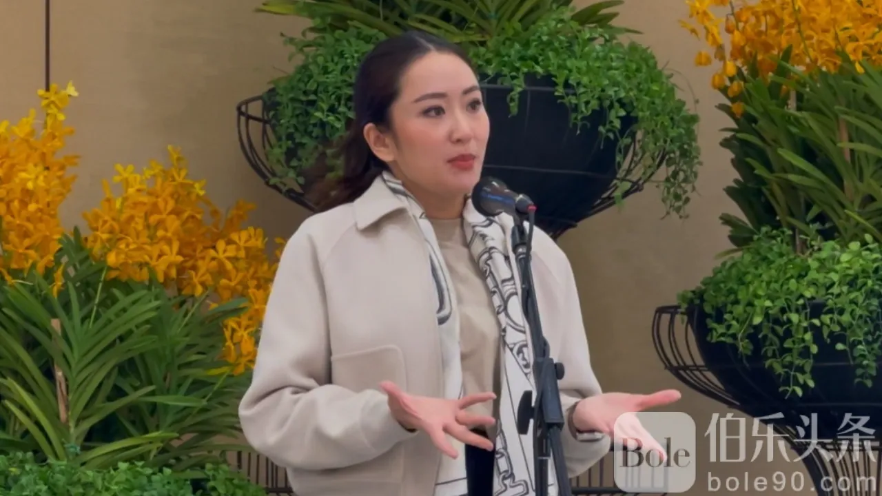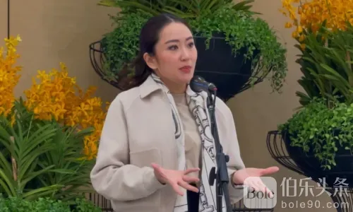 2025 年 1 月 25 日,总理帕通丹·西那瓦 (Pae Thongtan Shinawatra) 在素万那普机场接受采访,内容涉及人们举着反对娱乐中心的标语。