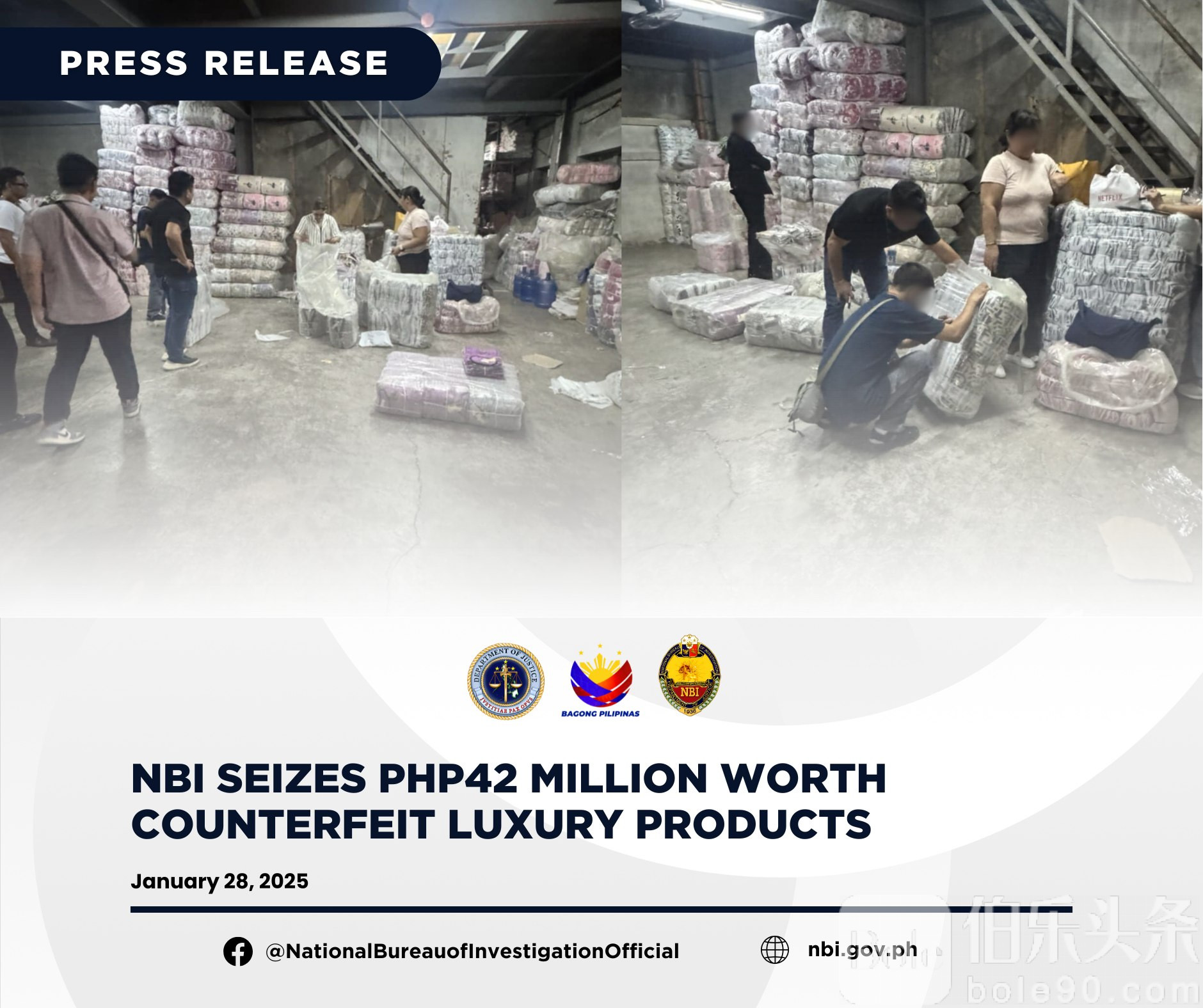 伯乐头条专讯:菲律宾国家调查局(NBI)知识产权权利保护处(IPRD)于2025年1月21日对帕赛市**STRATUM MERCHANDISING**实施三项搜查行动,成功查获大量假冒奢侈品。该商家因涉嫌违反《共和国法案第8293号》(RA 8293,商标侵权)而被调查。
