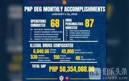 伯乐头条专讯:菲律宾国家警察缉毒大队 (PDEG) 周三表示,其特工今年 1 月缴获了价值 5035 万比索的非法毒品。