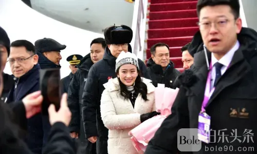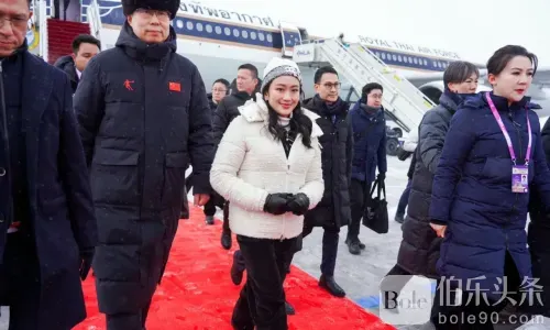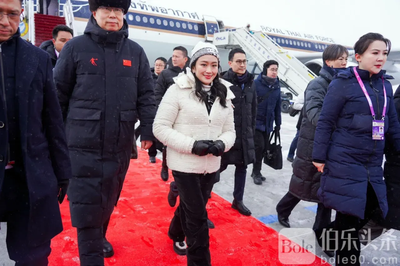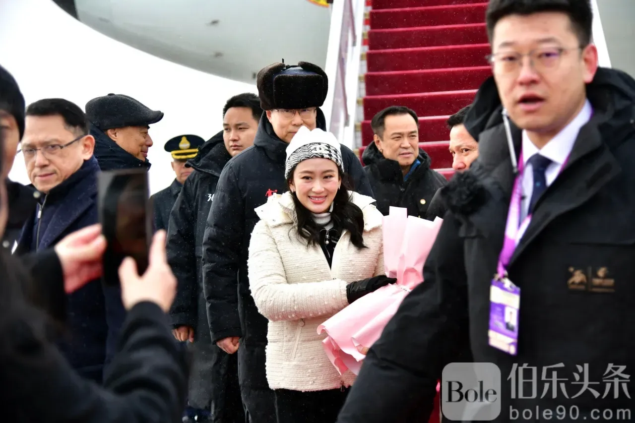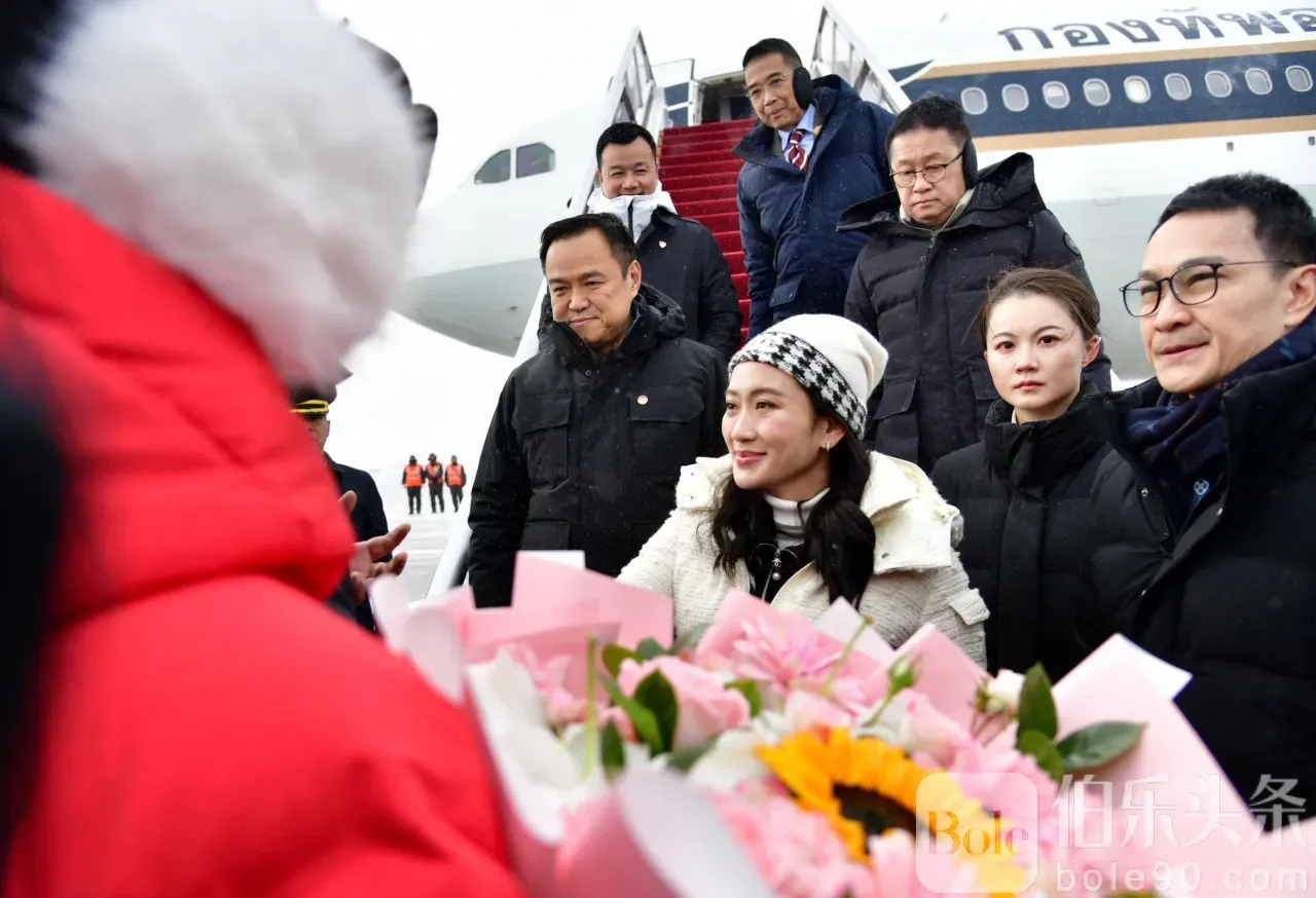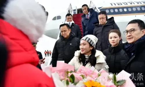 2025年2月7日上午9时40分,泰国总理巴东丹·西那瓦女士一行抵达中华人民共和国哈尔滨市哈尔滨太平国际机场。 (哈尔滨时间比泰国时间早1小时) 与全国政协主席蓝绍敏先生黑龙江省官员前来欢迎,一位中国妇女向他们献上一束鲜花表示欢迎。