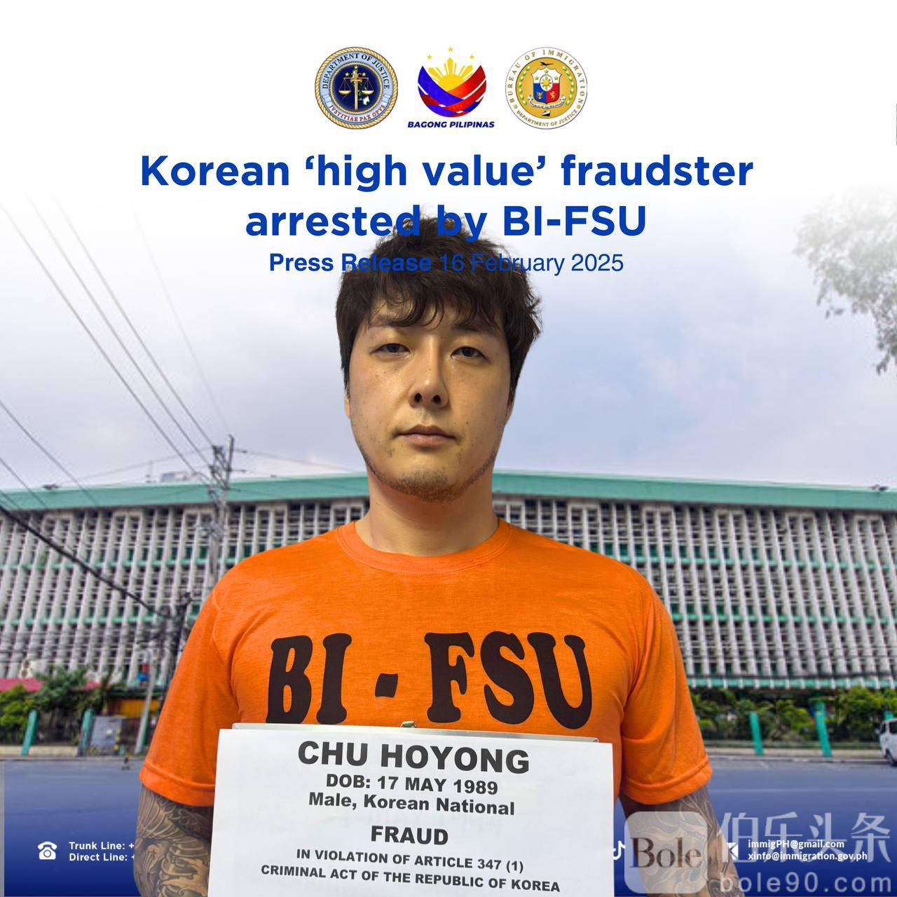 伯乐头条专讯:移民局局长乔尔·安东尼·维亚多确认,逃犯名叫 35 岁的 Chu Hoyong,上周三,移民局逃犯搜查组 (FSU) 的特工在马卡蒂市克鲁扎达街的住所逮捕了他。