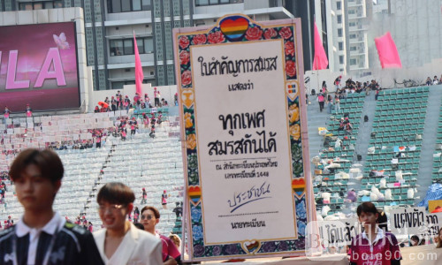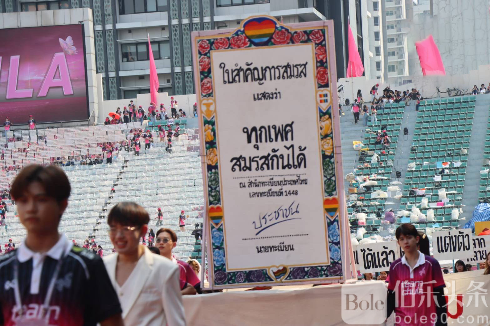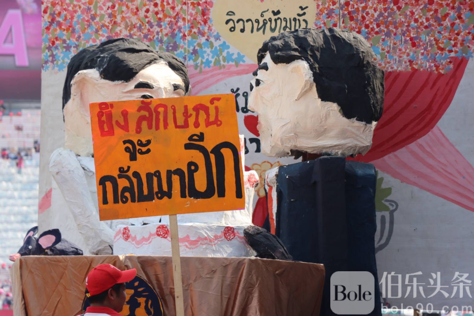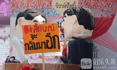 另有标语回顾2023年泰国大选后的政局变动,讽刺前前进党组阁期间,为泰党最终抛弃前进党组阁的政治操作,展现对当时政治博弈的不满,其中标语写道“迎亲队伍来了,但为泰党却临时与前前进党‘分手’,去与别的党派携手,民主成了寡妇,理想荡然无存”。