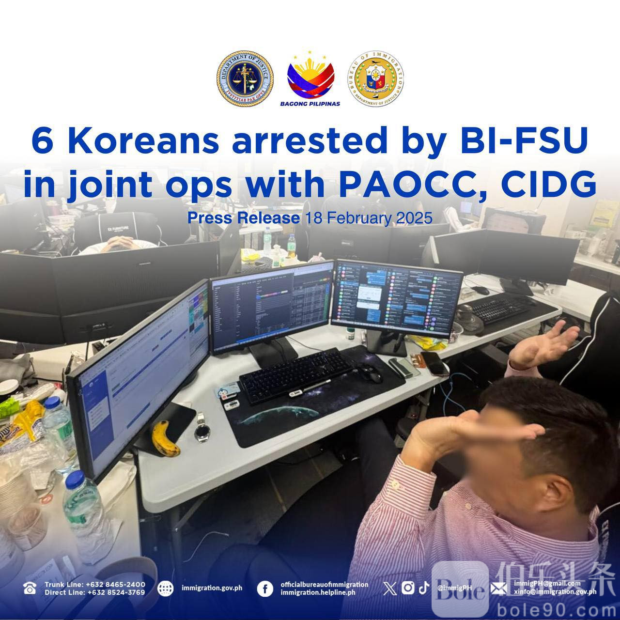 伯乐头条专讯:菲律宾移民局(BI)日前在帕赛市一家酒店突袭了一处涉嫌非法线上赌博的据点,逮捕6名韩国籍嫌犯。