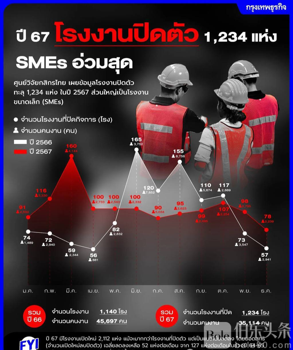 伯乐头条专讯:近日,泰国开泰研究中心公布数据称,2024年泰国有1,234家工厂关闭,累计对超35,114名劳工造成影响,影响人数较2023年有所减少,新增工厂则是有2,112家。