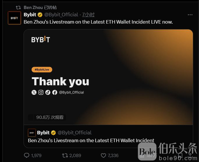 Bybit首席执行官Ben Zhou周五也在X平台上发文承认该事件。为了解决客户的担忧,Zhou还进行了直播,强调交易所资金的安全,并透露平台已经与合作伙伴申请了过桥贷款,已筹集约80%的资金来弥补损失。同时,Bybit将尝试追回资金,并对黑客采取必要的法律行动。