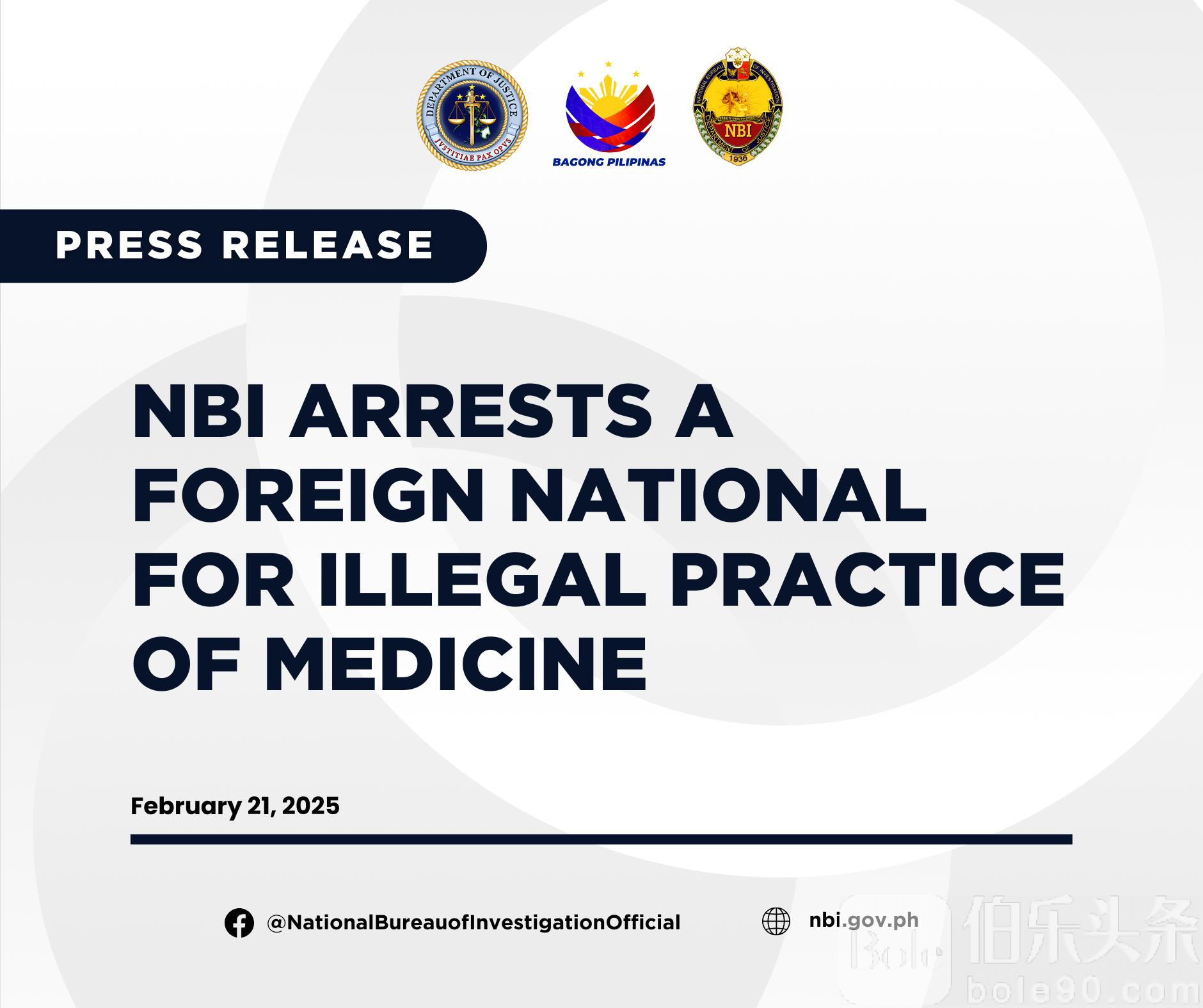 伯乐头条专讯:菲律宾国家调查局危险毒品司(NBI-DDD)近日在帕拉纳克市展开突击行动,逮捕了一名涉嫌非法行医的中国公民周杰群(Zhou Jiequn)。该行动由NBI局长哈伊梅·B·圣地亚哥(Jaime B. Santiago,退休法官)领导,嫌疑人被指控违反1959年《医疗法》(R.A. 2382)。
