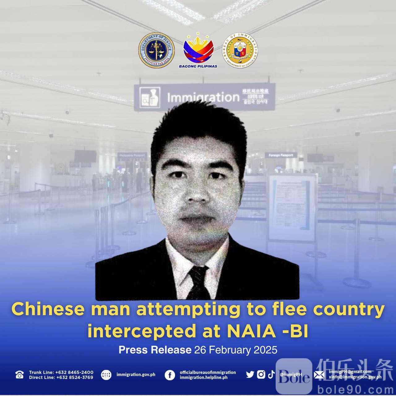 伯乐头条专讯:菲律宾移民局(BI)近日在尼诺伊·阿基诺国际机场(NAIA)成功拦截一名试图非法离境的中国籍男子,该男子因逾期居留两个月而被限制出境。