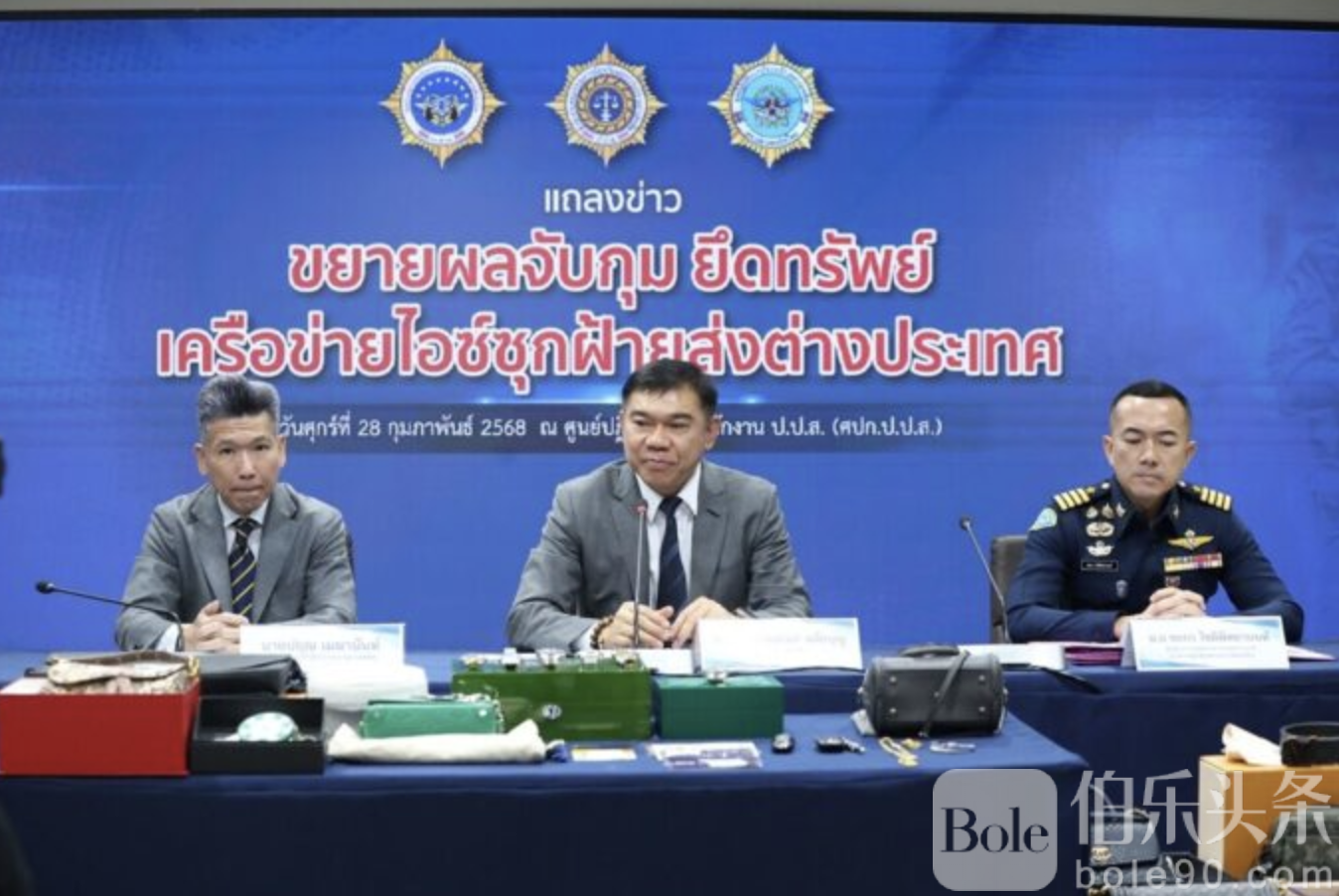 伯乐头条专讯: 2月28日,泰国毒品控制委员会召开新闻发布会,通报了近期成功捣毁一个跨国毒品贩运团伙的重大行动,并宣布已成功抓捕团伙头目。该团伙通过泰国作为中转站,计划将毒品运往第三国。此次行动中,警方缴获了1.65吨冰毒,并查封了总值超过2300万泰铢的资产,其中包括豪华保时捷轿车、劳力士手表及多个奢侈品。