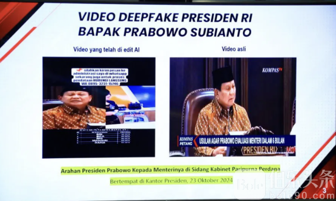 伯乐头条专讯:一段以印尼总统普拉博沃(Prabowo Subianto)为主角的深度伪造(Deepfake)影片近日在社交媒体上疯传,并被诈骗集团利用,导致全国20个省的大批民众受骗。诈骗者要求受害者支付25万至100万印尼盾(约80至320元人民币)作为“管理费”,以换取根本不存在的经济援助。