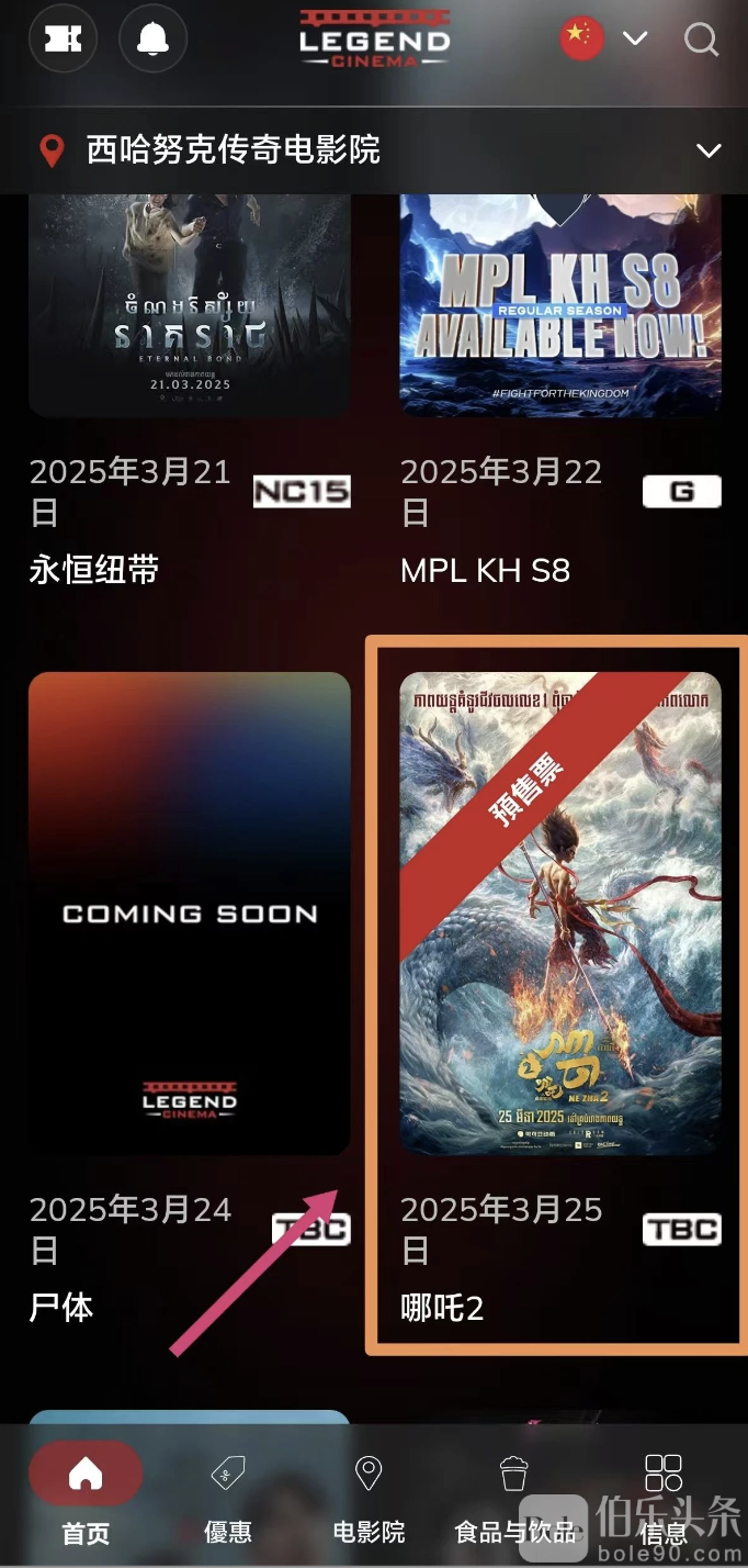 伯乐头条专讯:(伯友投稿)作为一个喜欢动画电影的人,我早就听说《哪吒2:魔童闹海》要在柬埔寨上映的消息。今天,我终于等到了预售开启的时刻,立刻动手抢票。整个购票过程其实非常简单,和国内差不多,今天就来分享一下我的购票体验。